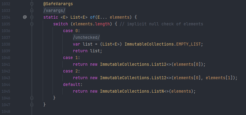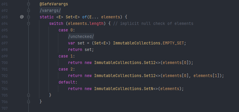 참고로, Set.of()와 List.of()는 파라미터를 가변인자로 받고 있기 때문에, 파라미터 개수 제한이 없다.