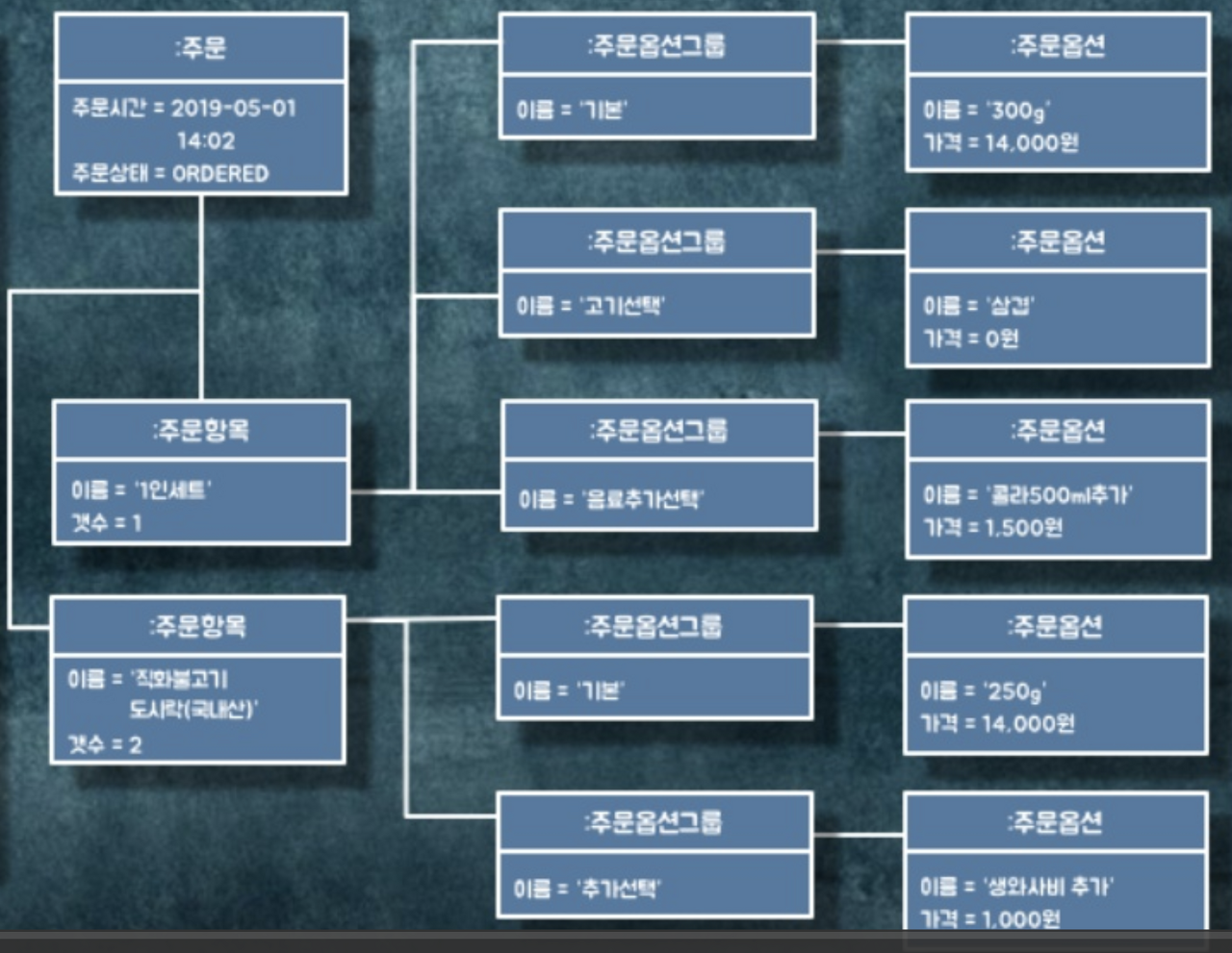 - 본 예제는 배달의민족 앱에서 장바구니에 있는 메뉴를 주문하는 로직을 단순화한 것이다.