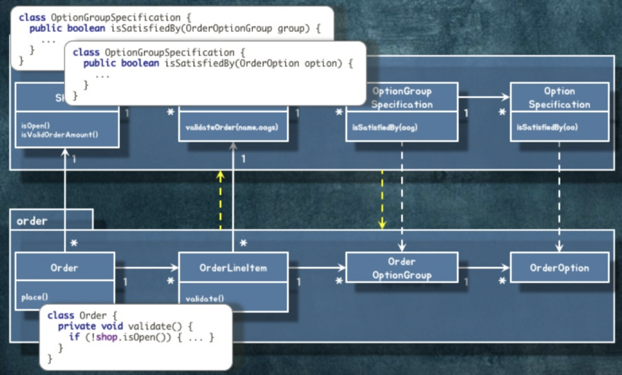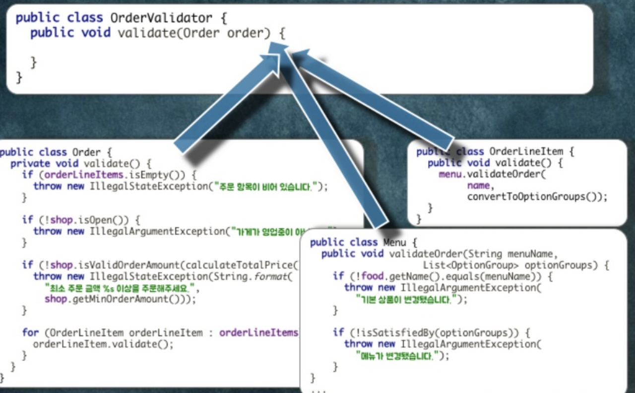 모든 Validation 로직을 각 객체에 넣게 되면, 어떤 Validation 로직이 수행되는 지 헷갈릴 수 있다. Validation 로직 같은 경우 한 눈으로 보는게 유리할 수 있기 때문에, 이런 경우 OrderValidator와 같은 객체를 새로 생성하여, Validation 책임을 위임시킬 수 있다. 이로써 가독성이 좋아질 수 있다.